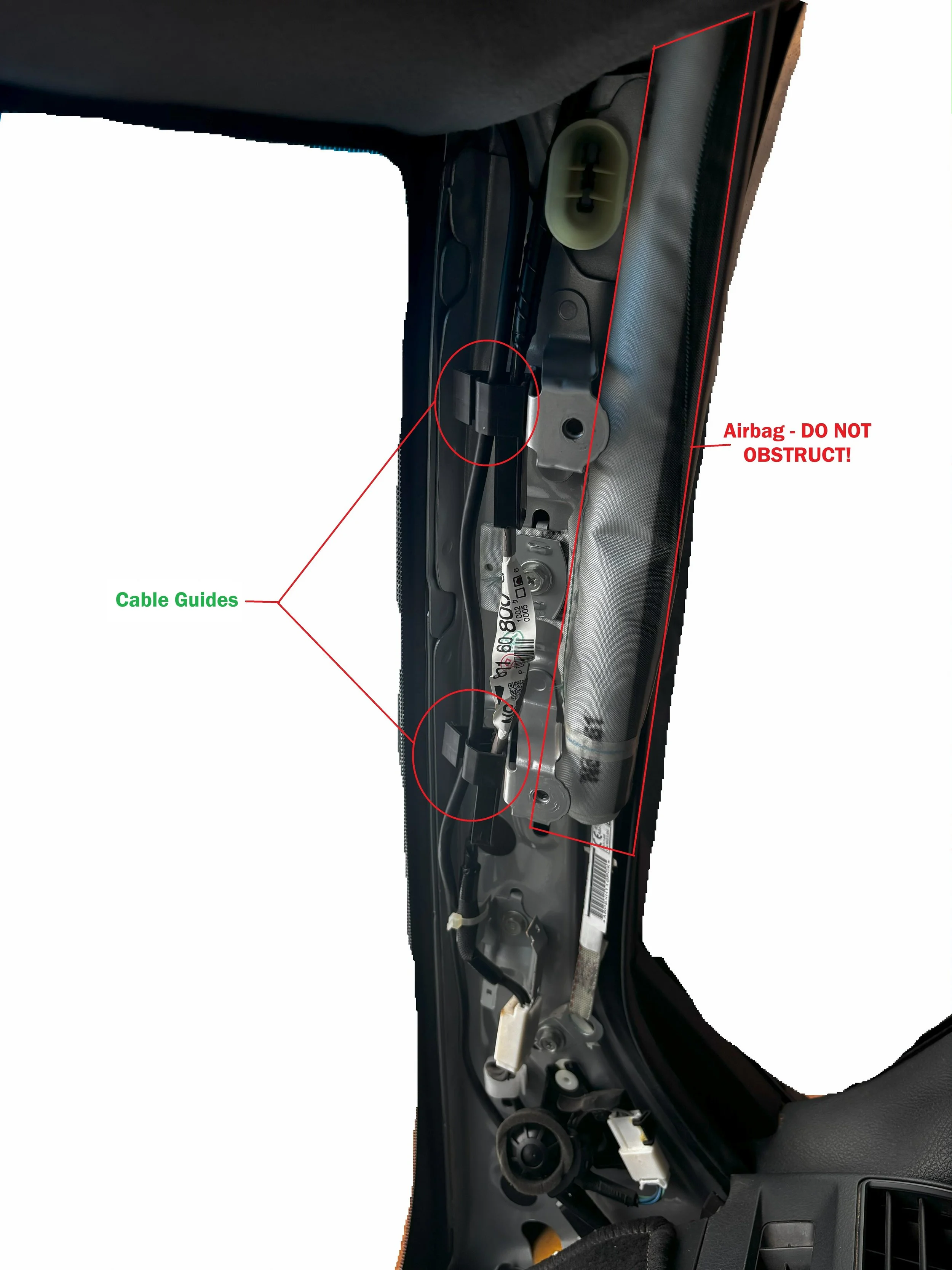 Pay extra attention when routing cables down the A-pillars, always use factory cables guides or use adequate cable management such as zip-ties.