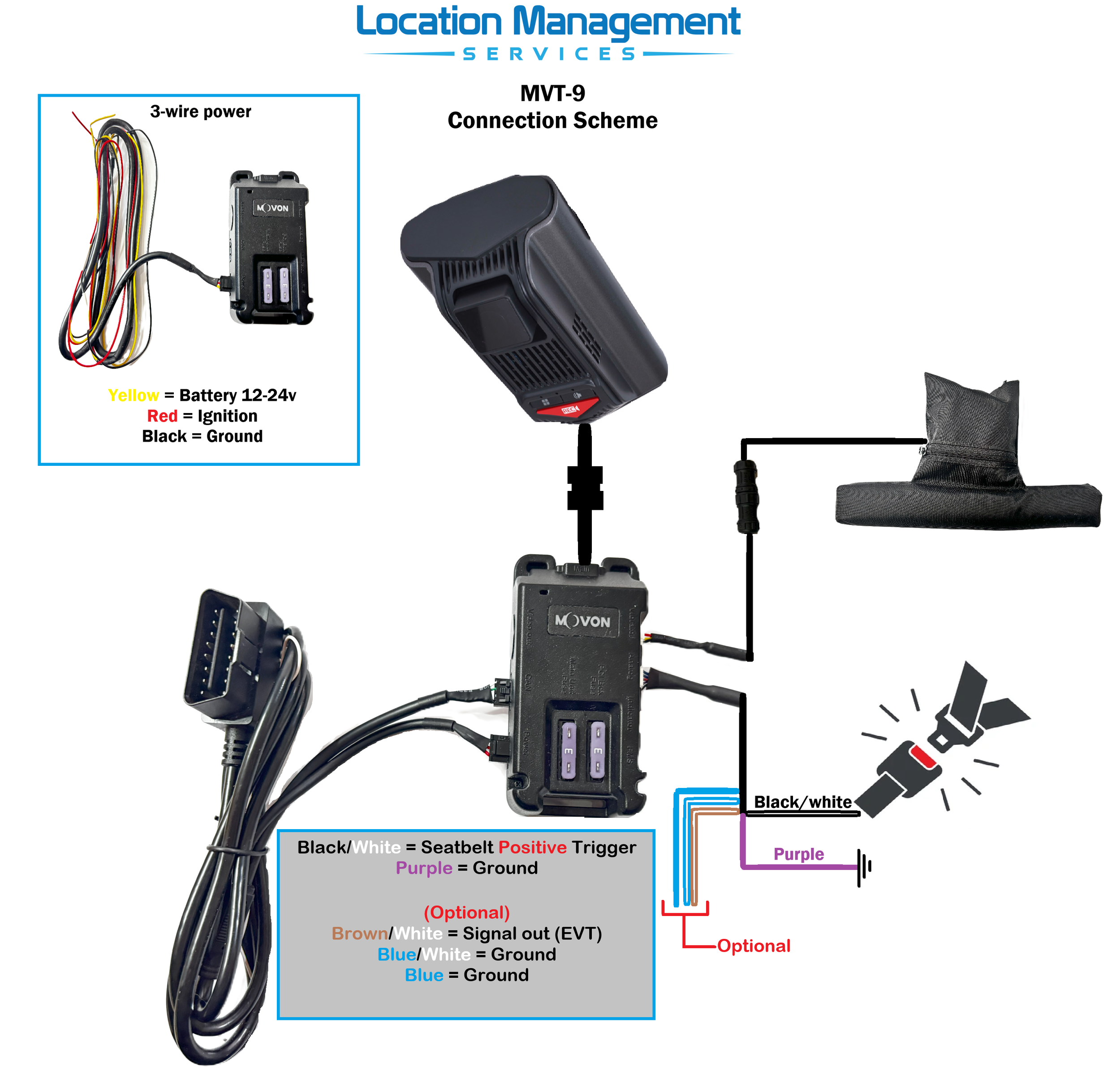 The MVT9 can be powered either by the 3-wire harness or the OBDII cable.